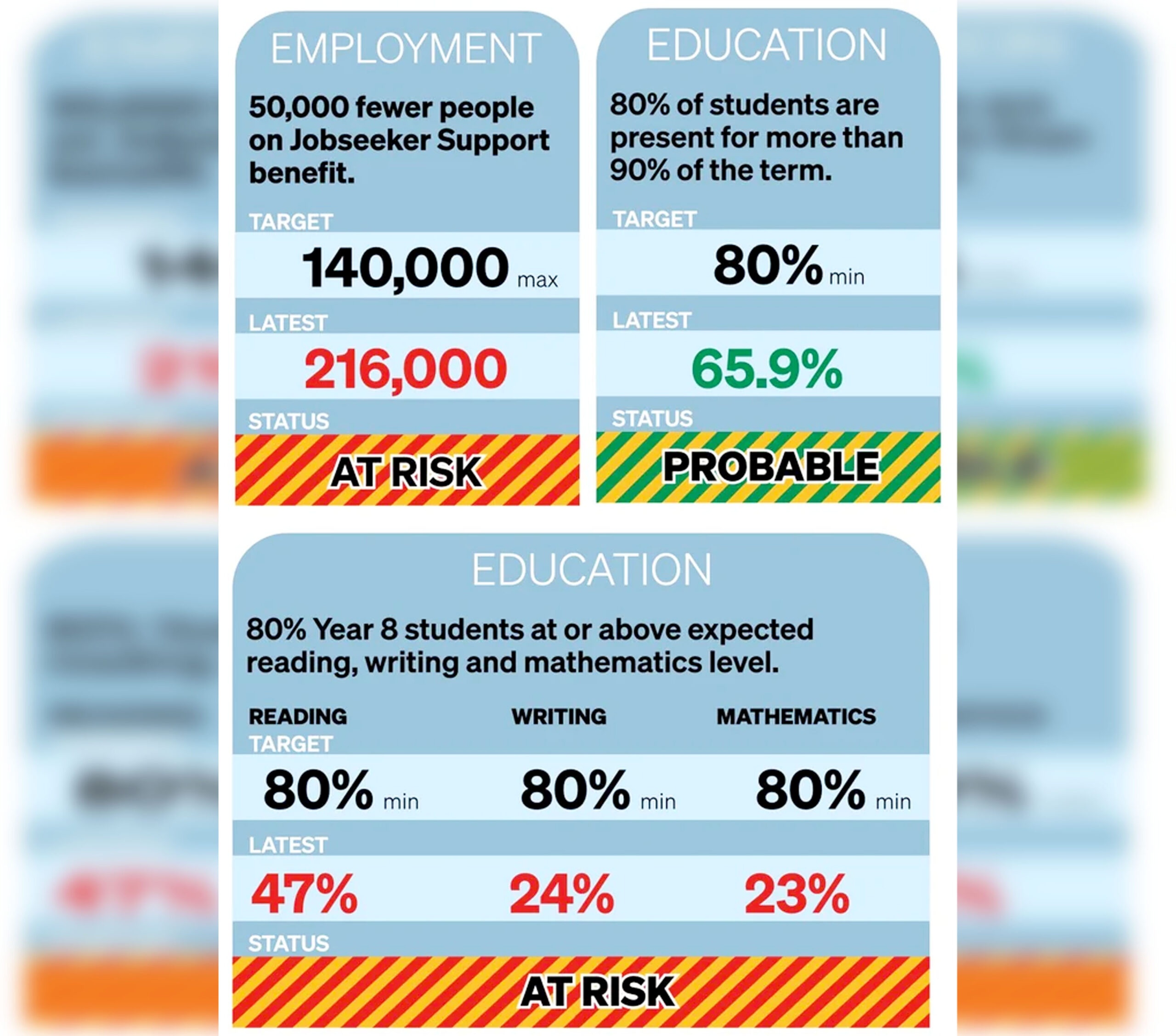 The health sector shows moderate improvement but remains under considerable strain. Two major health targets are classified as “feasible,” meaning achievable but with significant risks. Emergency department performance is especially concerning only 73.9% of patients are processed within the six-hour window, well below the 95% target. Experts warn that ED overcrowding cannot be solved in isolation—system-wide reforms involving primary care, aged care, and hospital bed management are required. A $20 million boost to ED staffing and $164 million over four years for urgent and after-hours care represent meaningful steps forward, yet transformational change will be needed to achieve 2030 goals. Elective treatment wait times show improvement—now 63.9% of patients are treated within four months—but still fall short of the 95% requirement.