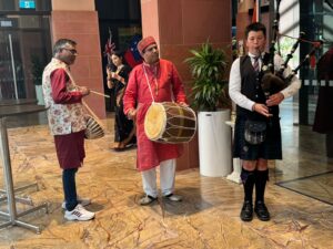 The celebrations commenced at 5:30 p.m. with the soulful strains of “Bedu Pako Baro Masa,” Uttarakhand’s iconic folk song, presented in a distinctive rendition on the bagpipes by Thomas Gear, accompanied by Chintamani on the dhol and Darmyan Bhandari on the damau—traditional percussion instruments of the hill state. Their spirited performance created an evocative atmosphere and welcomed guests in true Uttarakhandi style.
