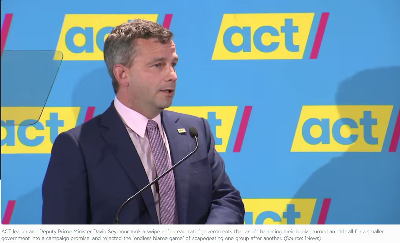 ACT leader and Deputy Prime Minister David Seymour took a swipe at “bureaucratic” governments that aren’t balancing their books, turned an old call for a smaller government into a campaign promise, and rejected the “endless blame game” of scapegoating one group after another.